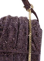The Iris shoulder bag by Benedetta Bruzziches dazzles in rhinestone crystal mesh, shaped into a ruched rectangular silhouette that captures the essence of modern glamour and artistry.