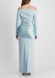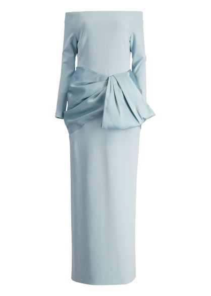 The Kori gown from Solace London exudes modern elegance with its off-the-shoulder neck and form-fitting silhouette in crepe, while a voluminous draped satin detail at the waist adds bold contrast and couture-level drama.