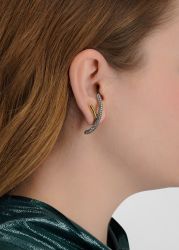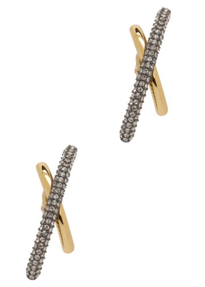 The Marnie Earrings from Demarson showcase an intersecting design, where a sparkling crystal-encrusted arc crosses a sleek gold-tone bar, creating a sculptural interplay of light and form that feels effortlessly modern.