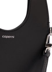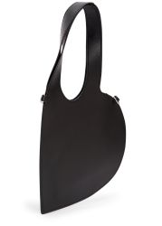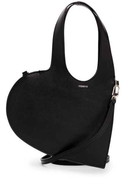 The Mini Heart tote from Coperni is crafted from soft, tactile black leather shaped into a slim heart-like silhouette with smooth curves and a sculptural arch handle that adds to its playful charm.