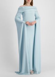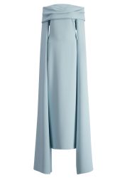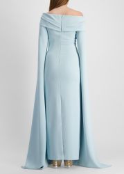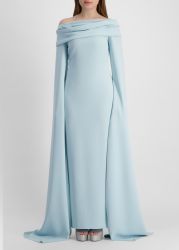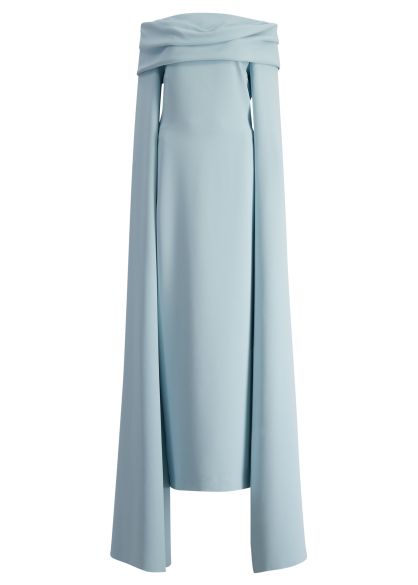 The Nuri crepe gown from Solace London stuns with a draped off-the-shoulder neck that frames the collarbones with elegance. Floor-sweeping cape sleeves and a column silhouette bring understated drama.
