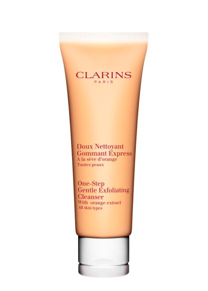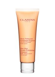 - The Clarins One-Step Gentle Exfoliating Cleanser with Orange Extract is a spa-fresh exfoliating facial cleanser that polishes-away make-up, embedded impurities and spent surface cells in one time-saving step to reveal the glowing skin beneath. The bi-phase scrub both cleanses and exfoliates, gently removing everything that makes the skin look dull, leaving the skin smooth, soft and luminous. Orange extract works to soften, refresh and revive. Moringa Seed extract, with anti-pollution benefits, purifies and refines the skin and helps to restore its natural radiance. Gentle Silica Microbeads tackle clogged pores, exfoliate and renew. The exfoliating scrub leaves skin comfortable and ultimately refreshed.