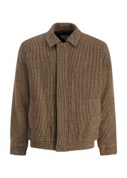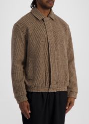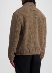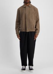 The Perry jacket from Noyoco is knitted from tricolour recycled wool, its relaxed boxy form framed by a classic collar, elasticated cuffs, and welt pockets that bring quiet structure to the textured design.