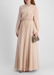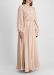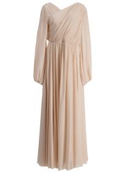 This dress from Alberta Ferretti is crafted from airy silk chiffon with a pleated crossover bodice, sheer blouson sleeves, and a fitted waist that flows into a gathered, floor-length skirt for an effortlessly elegant look.