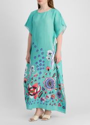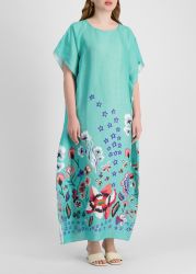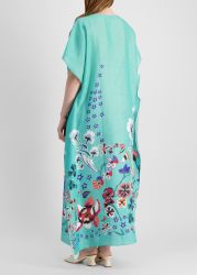 This linen kaftan from Isa Belle showcases a vivid garden of playful florals and bold figurative motifs, including bees, blooming along the hem. Its airy silhouette and vibrant turquoise hue evoke an effortless resort mood, perfect for sun-drenched escapes.