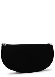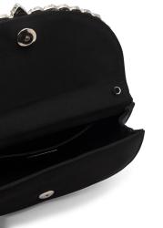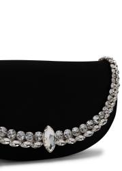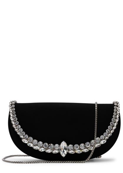 The Riviera clutch from L’alingi is sculpted from black satin and adorned with a sweeping arc of luminous crystals across the front and a striking marquise stone centrepiece for added glamour.