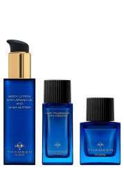 This Thameen Riviere Essential Set features the classic fragrance from the Treasure Collection, the hair fragrance of the same magnificent scent with keratin and the complementing body lotion infused with argan oil and shea butter. Use them together to enjoy a sensorial olfactive experience like no other.