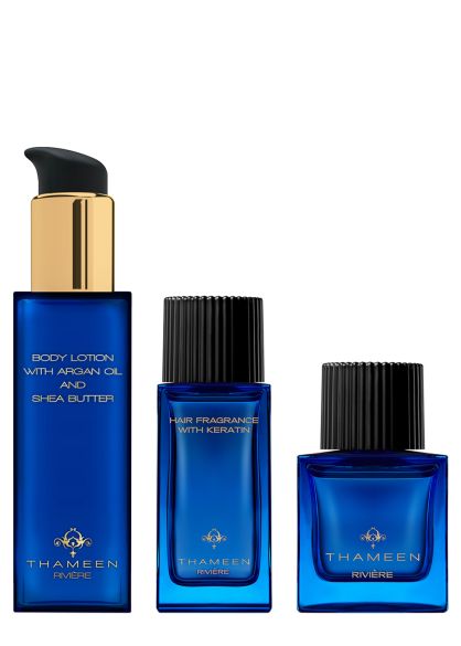 - This Thameen Riviere Essential Set features the classic fragrance from the Treasure Collection, the hair fragrance of the same magnificent scent with keratin and the complementing body lotion infused with argan oil and shea butter. Use them together to enjoy a sensorial olfactive experience like no other.