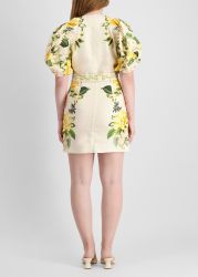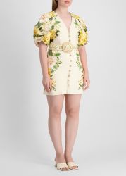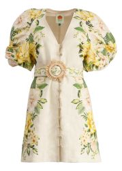 The Sand Garden Cascade mini dress by Farm Rio is crafted from breezy linen canvas and painted in vibrant, warm hues that echo a lush garden in full bloom. This button-front style features a v-neck and statement belt that cinches the waist for a flattering finish.