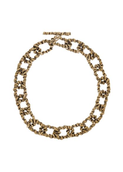 The Signature necklace from Paola Sighinolfi features bold sculptural links wrapped in textured metallic detailing, creating a striking statement that blends artisanal craft with contemporary elegance.
