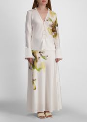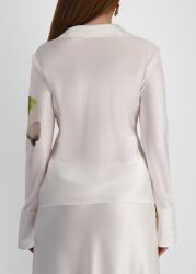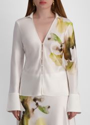 The Spunhill shirt by Acler is crafted from bias-cut satin for a flattering, fluid drape and detailed with a plunging neck, structured collar, wide cuffs, and painterly blooms that lend a romantic softness to its refined silhouette.