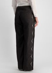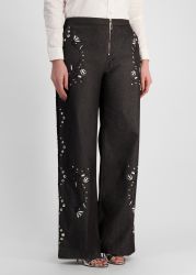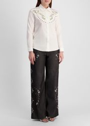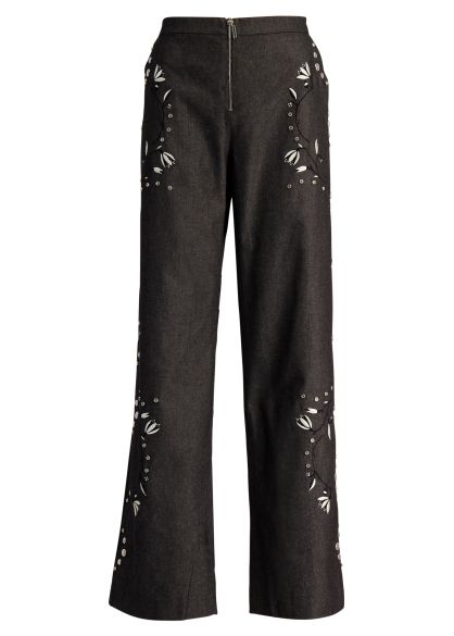 Fusing utility with artisanal detailing, The Grammy trousers from Nafsika Skourti are crafted from structured denim in a straight-leg silhouette, punctuated by floral embroidery and stud embellishments that trace the legs.