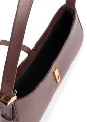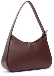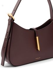 The Tokyo bag by DeMellier reimagines everyday elegance with a sculptural triangular silhouette in rich burgundy leather, framed by a wide shoulder strap and sealed with the signature arrow lock.