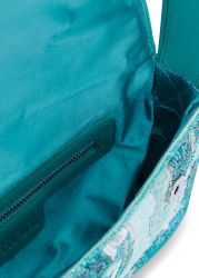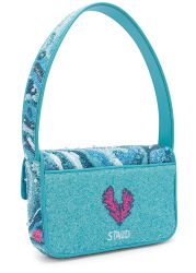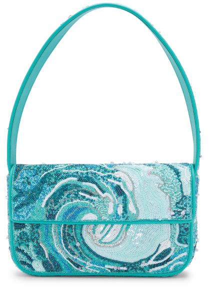The Tommy shoulder bag from Staud dazzles with hand-applied beads and sequins forming hypnotic tidal waves and is trimmed with sleek vegan leather piping for a polished finish.