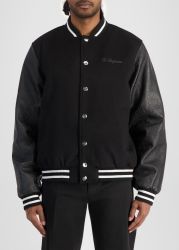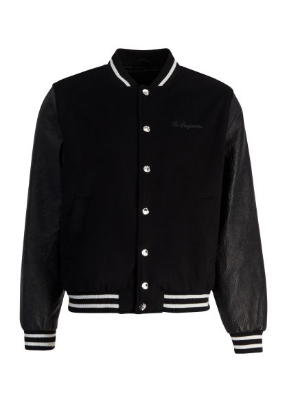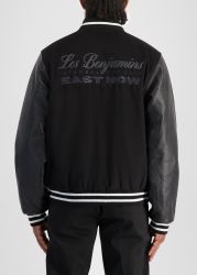 This jacket from Les Benjamins revisits the varsity silhouette with a modern streetwear sensibility, crafted from a soft wool blend and finished with striped trims and metallic buttons for a polished athletic edge.