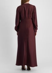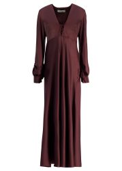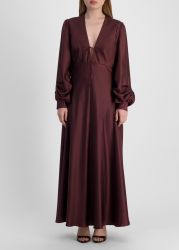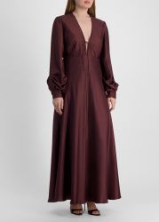 The Valerie dress from Raquel Diniz is crafted from fluid silk twill with a plunging neck accented by delicate ties. Blouson sleeves with gathered cuffs introduce sculptural drama, while a defined waist flows into a floaty, maxi-length skirt.