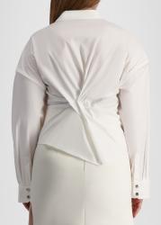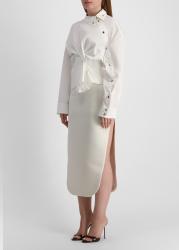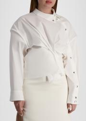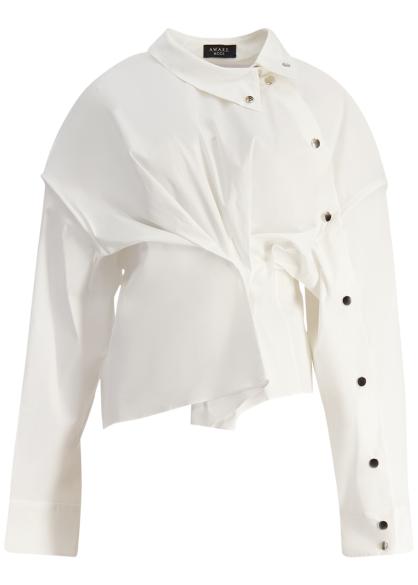A.W.A.K.E. Mode reimagines classic shirting with sculptural ease in this top, featuring an asymmetric cold-shoulder cut-out, double collar detailing, and all-over silver-tone grommets that add a bold, industrial edge to the crisp cotton silhouette.